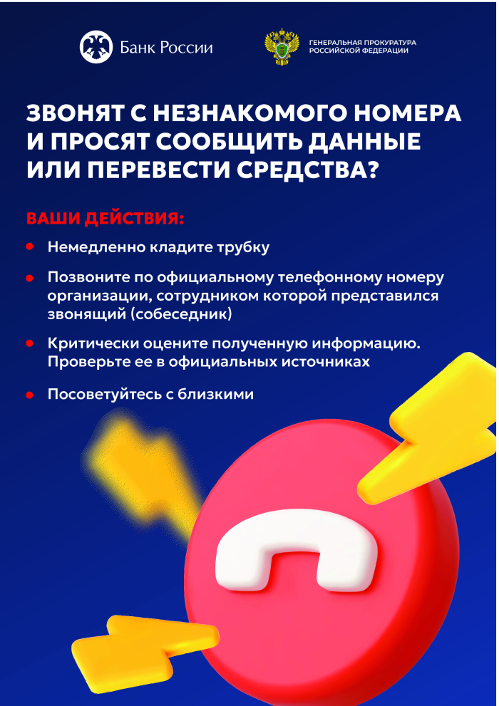 Помните, что сотрудники банков никогда не будут Вам звонить по телефону с целью уточнения номера карты, ПИН-кода, срока окончания действия карты, СМС-паролей банка, логина и пароля для входа в онлайн-банк, контрольной информации (кодового слова), и никогда не требуют совершать каких-либо операций с картой. Если собеседник просит Вас назвать хоть один из вышеперечисленных пунктов – это мошенники, немедленно завершите разговор. Для полной уверенности позвоните на «горячую» линию своего банка. Не сообщайте незнакомым людям информацию о: сроке окончания действия карты, трехзначном коде на обороте карты, СМС-паролях для подтверждения Интернет-операций. Не доверяйте незнакомцам, даже если они обращаются к Вам по фамилии, имени и отчеству.