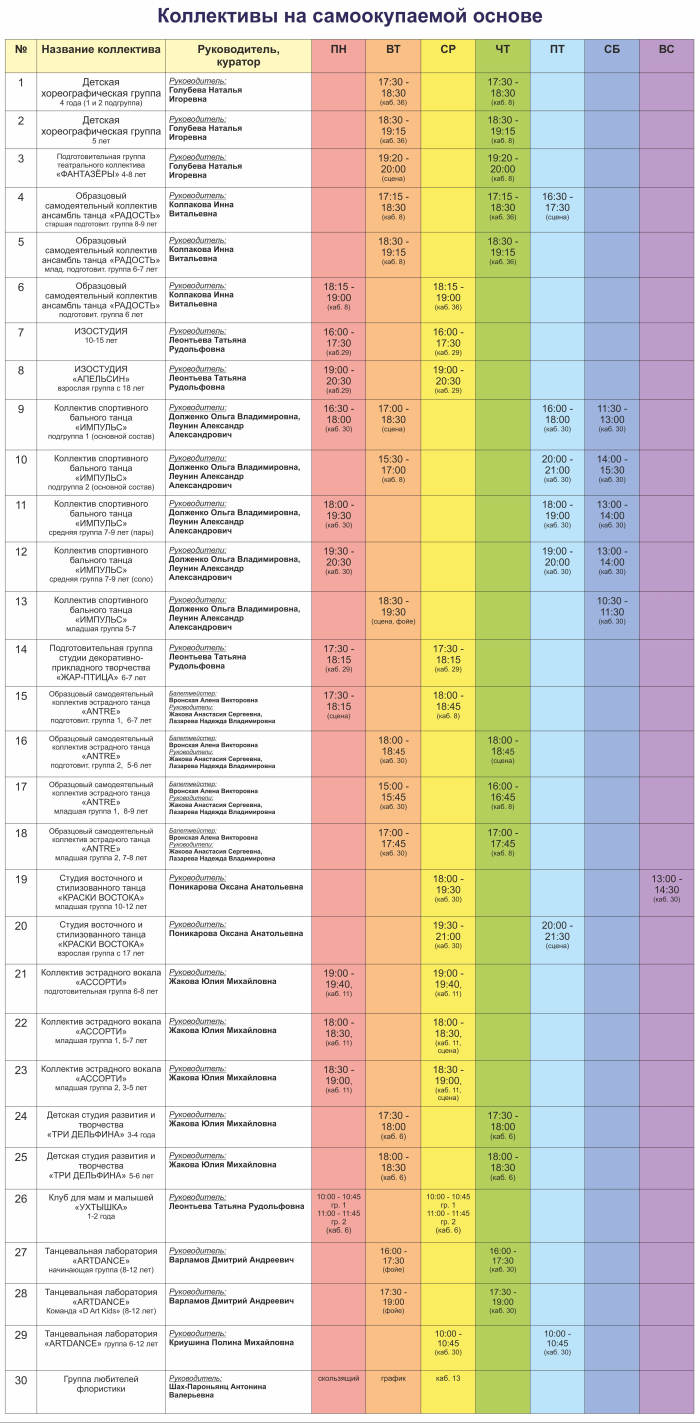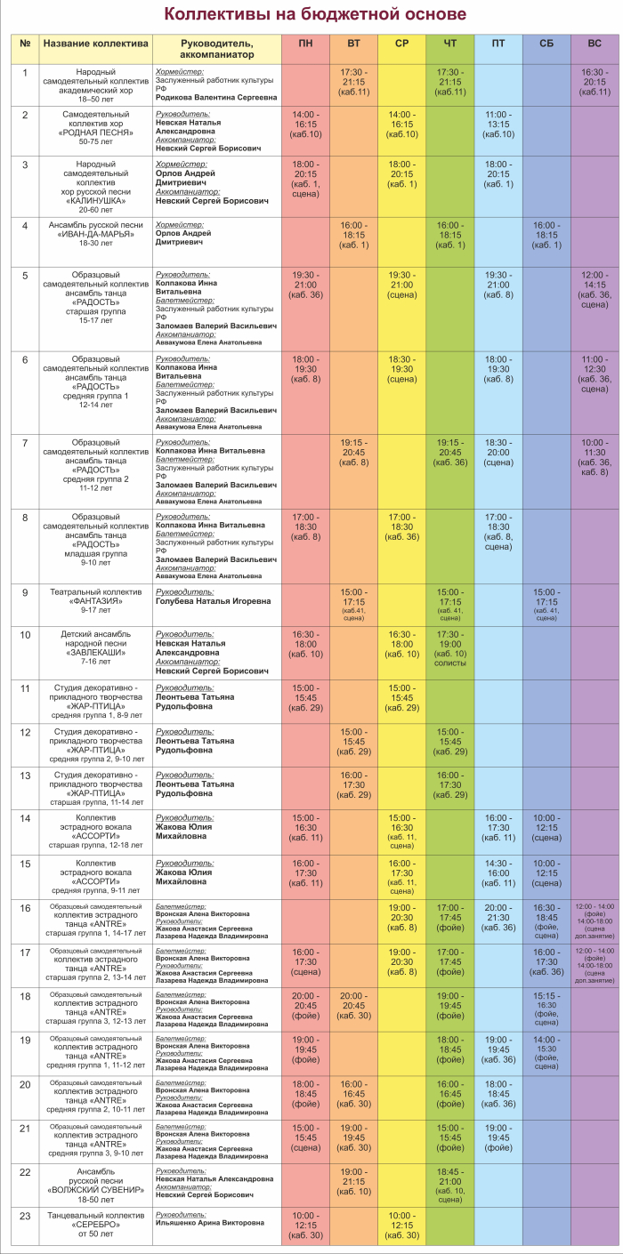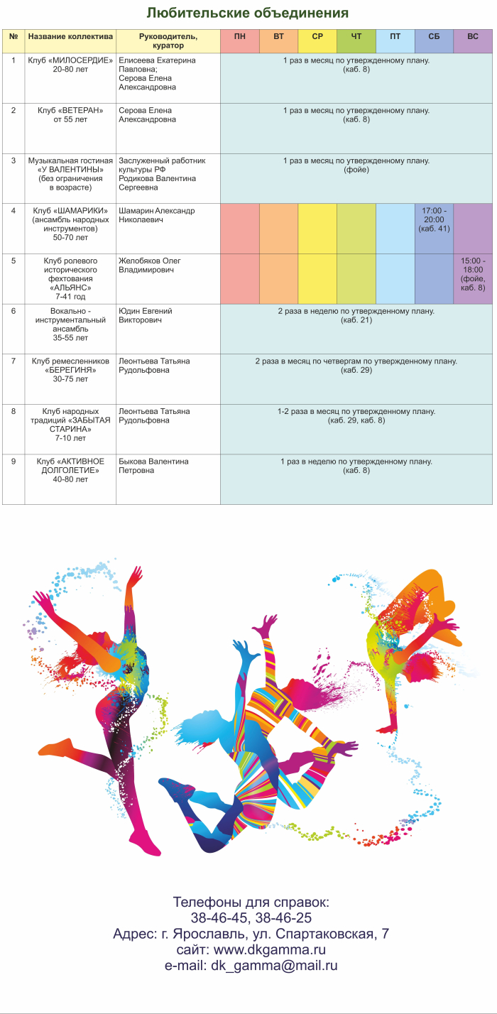 РАСПИСАНИЕ РАБОТЫ ТВОРЧЕСКИХ КОЛЛЕКТИВОВ МУНИЦИПАЛЬНОГО АВТОНОМНОГО УЧРЕЖДЕНИЯ ГОРОДА ЯРОСЛАВЛЯ "ДОМ КУЛЬТУРЫ "ГАММА" НА 2025-2026 ГОД