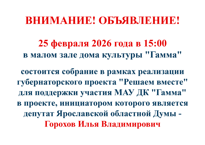 Уважаемые посетители! Просим вас оценить работу дома культуры "Гамма", пройдя по ЭТОЙ ССЫЛКЕ Ваше мнение очень важно не только для нас, но для Министерства культуры Российской Федерации. Оно поможет получить независимую и честную оценку удовлетворенности граждан России работой государственных и муниципальных организаций культуры, искусства и народного творчества.